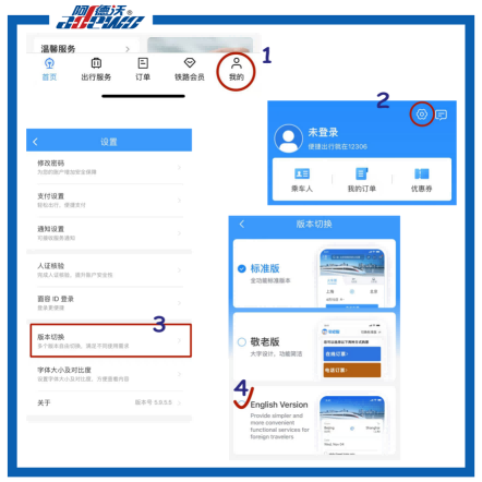 12306 অ্যাপ ডাউনলোড করুন, "Me(নীচে) → "সেটিংস" → "সংস্করণ পরিবর্তন করুন" → ইংরেজি সংস্করণে যেতে ইংরেজি নির্বাচন করুন।