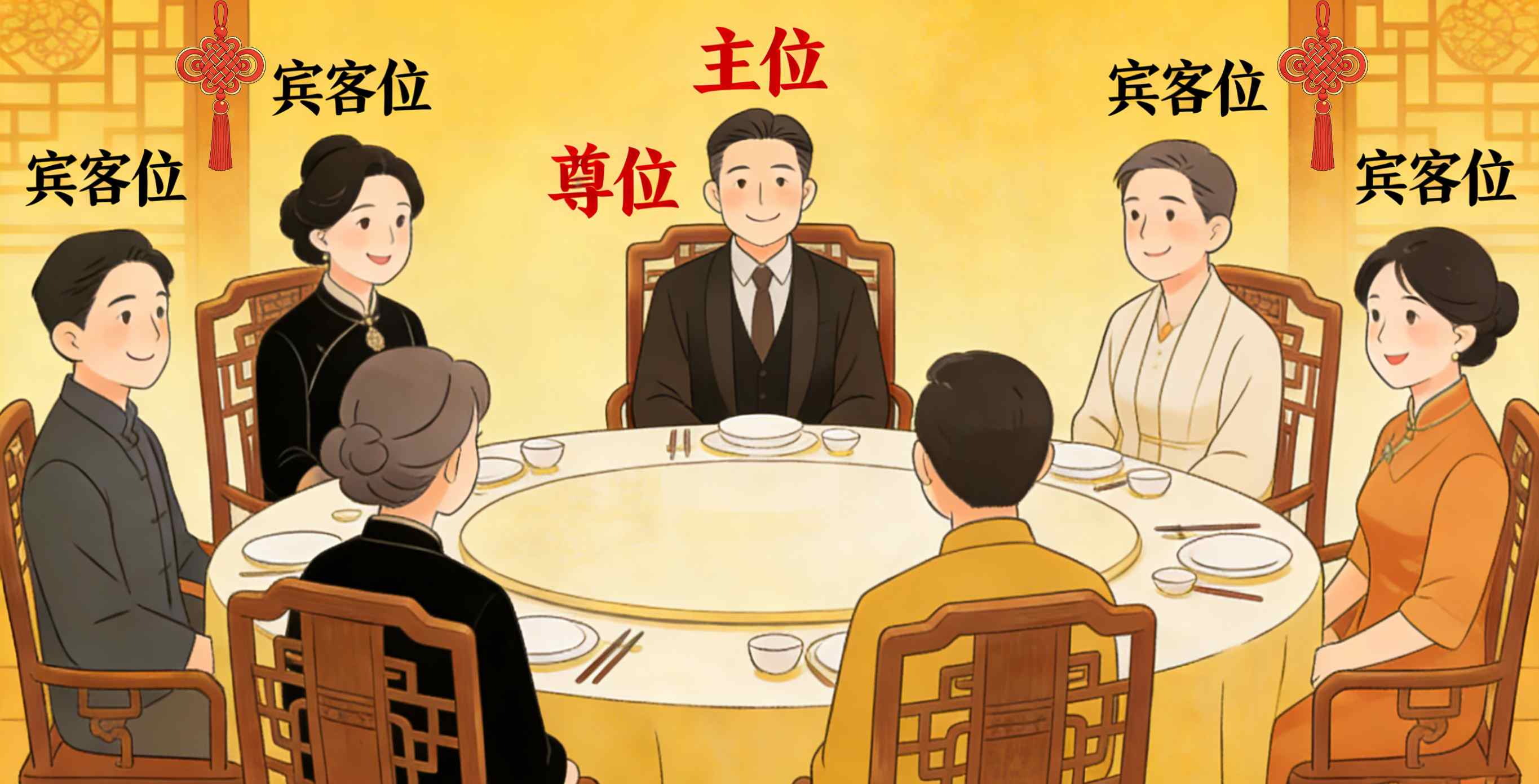 ঐতিহ্যগত চীনা বসার ক্ষেত্রে, সবচেয়ে সম্মানিত অবস্থান সাধারণত দক্ষিণ দিকে মুখ করে, টেবিলের উত্তর দিকে অবস্থিত।